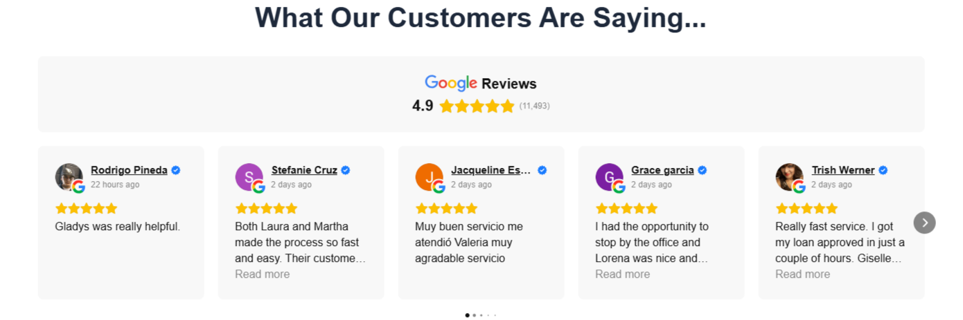 Customer reviews updated live with the big 4.9 star Google rating right at the top, real customer photos, names, and daily updated reviews in nice clean cards. The flow and layout make it easy for people to see genuine social proof fast which builds real trust so they feel confident and apply immediately.