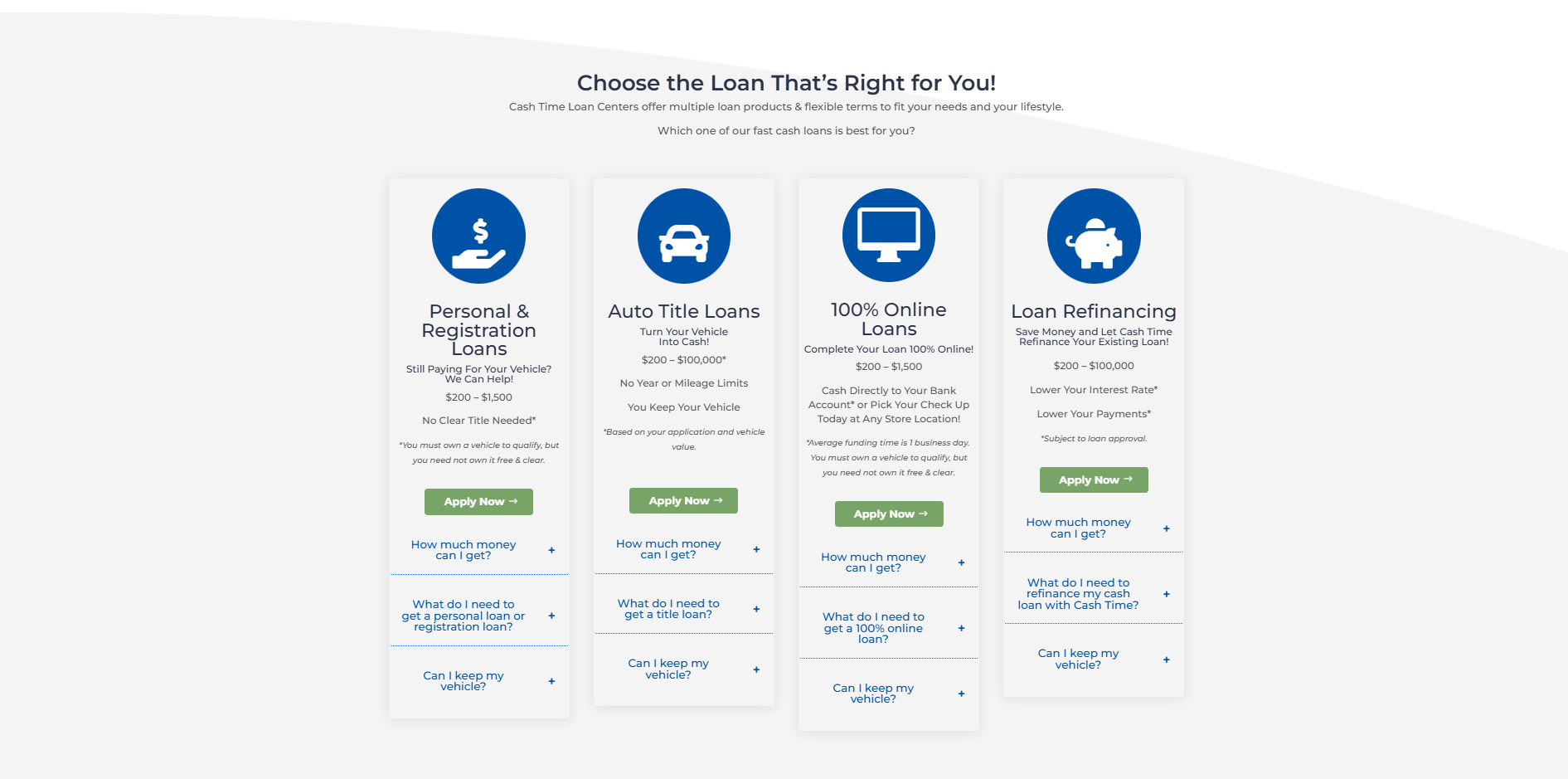 The “Choose Your Loan” page features bold clear icons, short simple text, and a logical order. This creates smooth user experience so people can quickly scan the options, pick their loan type, and apply right away.