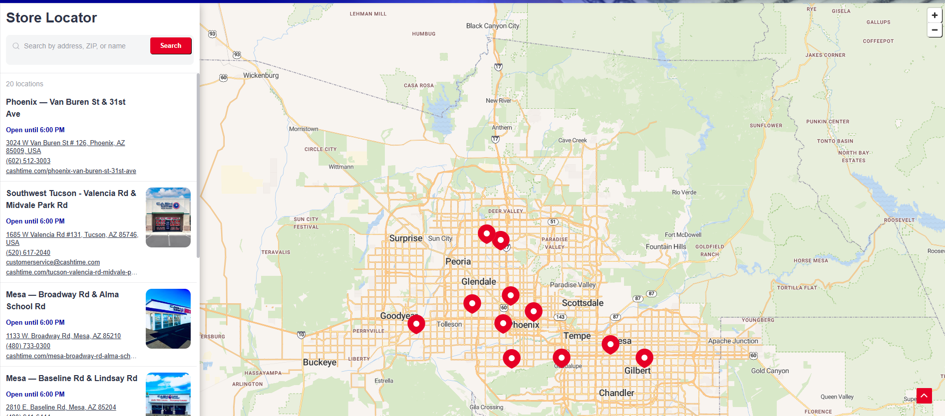 The location section is clean and powerful with a big interactive map full of red pins showing all our Arizona stores plus a clear sidebar list with real store photos, addresses, hours and phone numbers. This section can be edited outside of Wordpress making it user turn key.