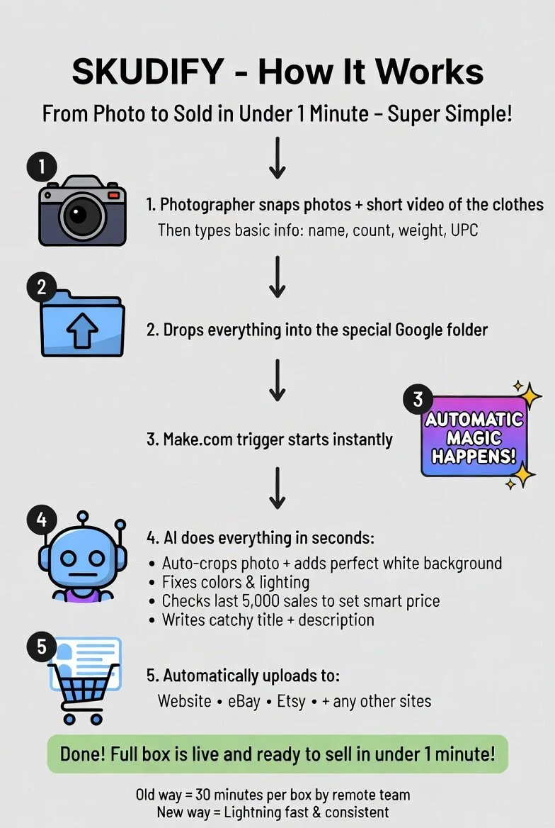 Now the photographer snaps the photos and videos, then just types in the UPC, name, count, and weight in the information on the file. The file drops into that Google folder. The folder has an automation trigger... as soon as anything new lands there, Make.com kicks off the whole chain. Photos get auto-cropped, perfect white background, color and contrast fixed. ChatGPT takes all the info the photographer entered, checks our database of the last 5,000 orders and prices, calculates the right price per pound, writes the title and full description, then automatically uploads to the website, eBay, Etsy, and anywhere else we want. The whole thing finishes in under one minute.