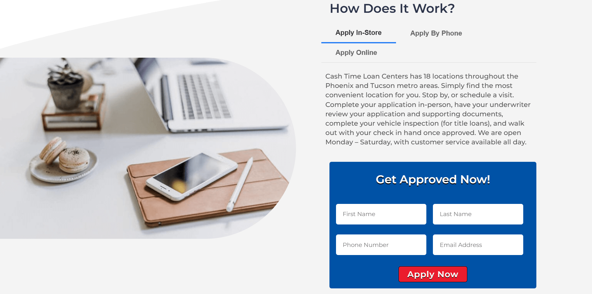 My theme for the website is fun and on-brand with a custom Arizona desert illustration inspired by an Arizona license plate… showing our storefront, a cool blue car on the road, and saguaros. The three big bold red buttons for Call Now, Apply Online, and Find a Location stand out perfectly.